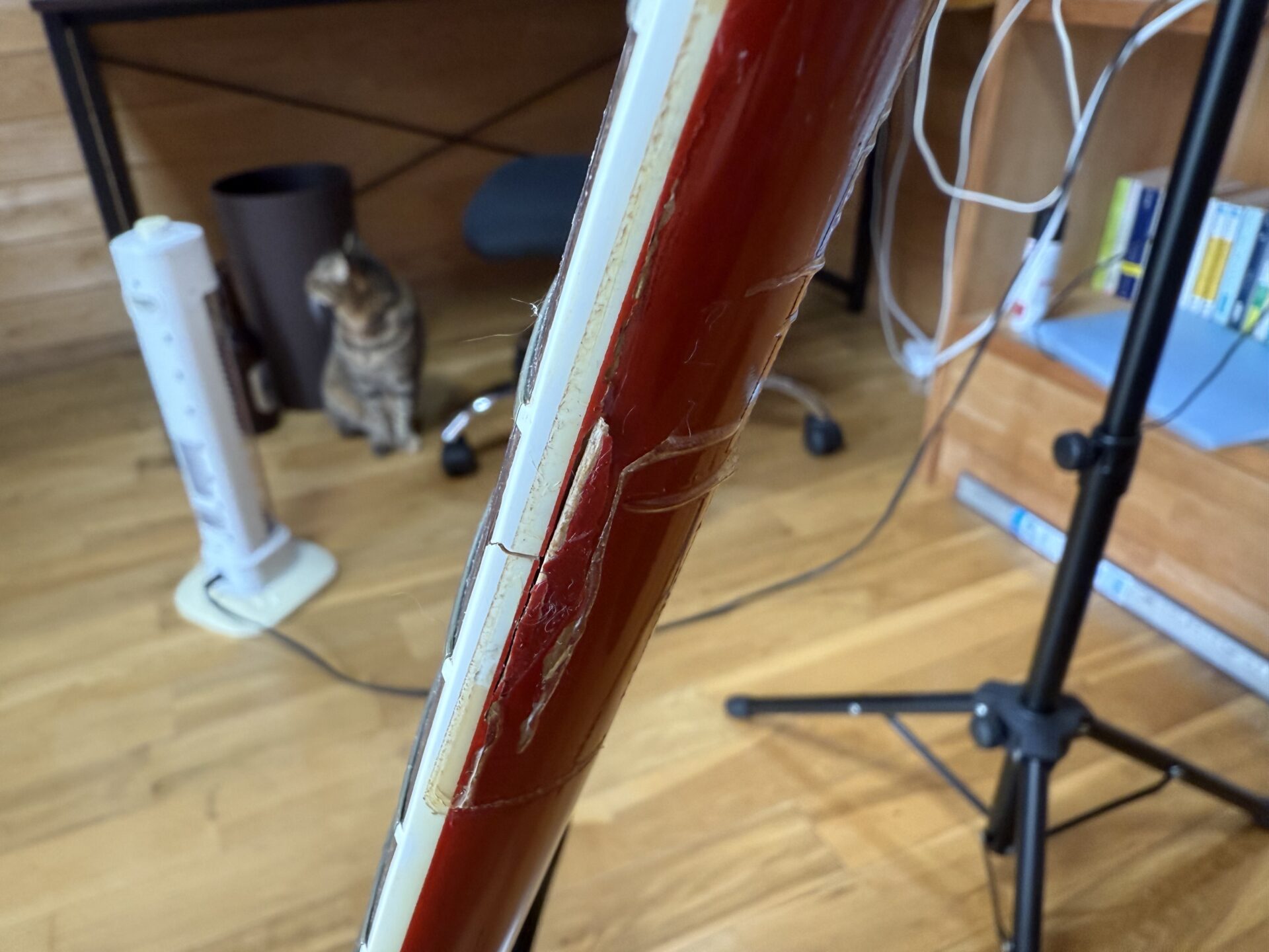 見た瞬間、全く記憶になかったため「誰かに壊されていたのか?」と思いましたが、時間が経つにつれ記憶の片隅からネックのこの有り様が、おぼろげではあるが浮き上がって来ていることに気づきました。