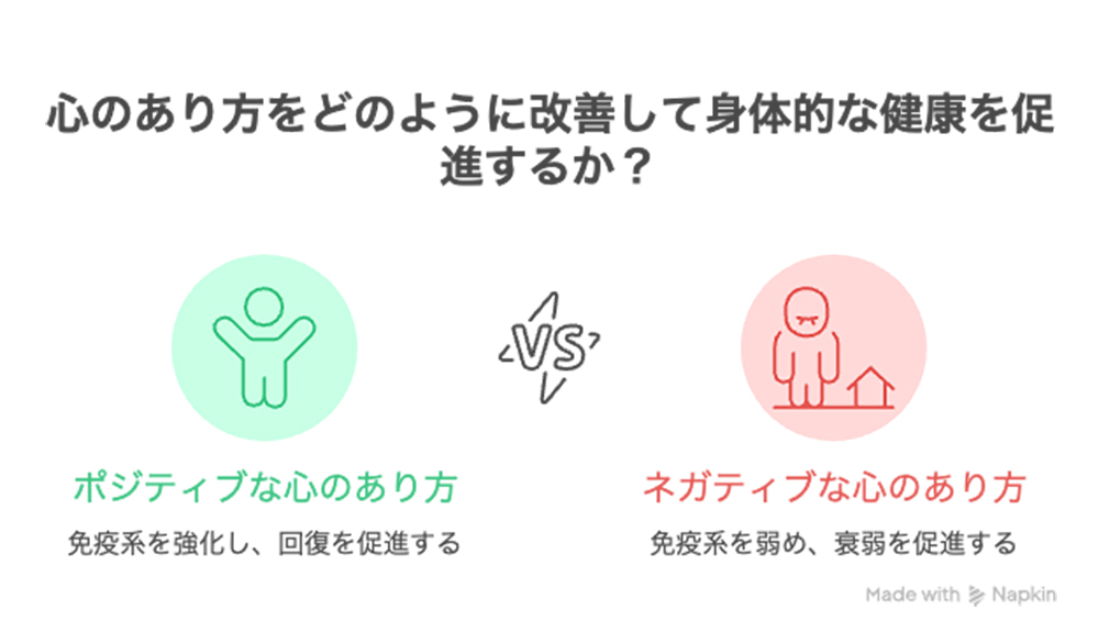 これはポジティブ心理学でいう「心身の相関性」そのものであり、持続的な幸福(ウェルビーイング)が身体的な健康の土台であることを示唆しています。
